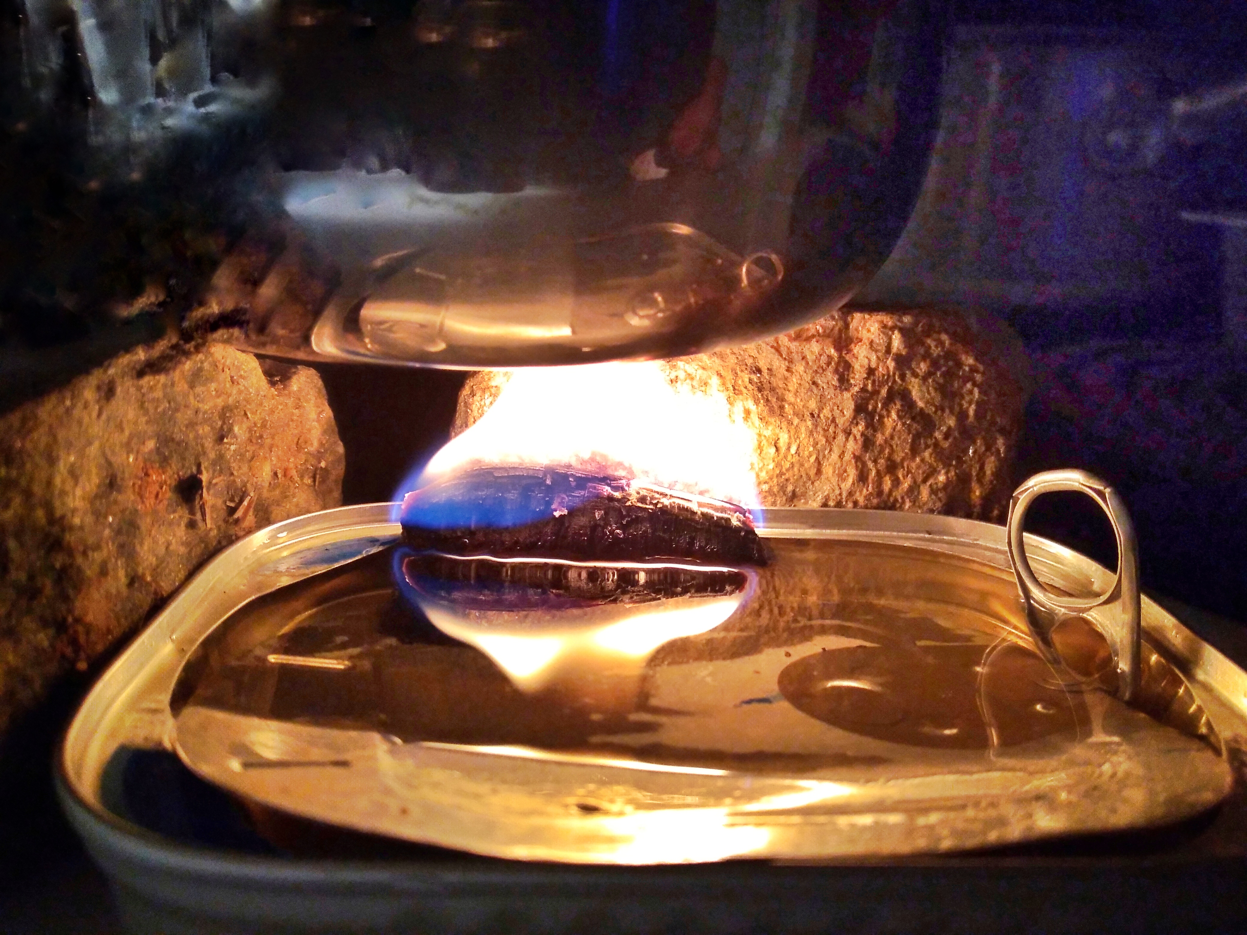 I used an empty sardine can for my vessel and poured in vegetable oil for fuel. I cut a slice of the bottom layer of my fungus and initially soaked it briefly in the oil. When I removed it, I wiped off the excess oil then lit the flat bottom edge until it took flame to prime it for use.
